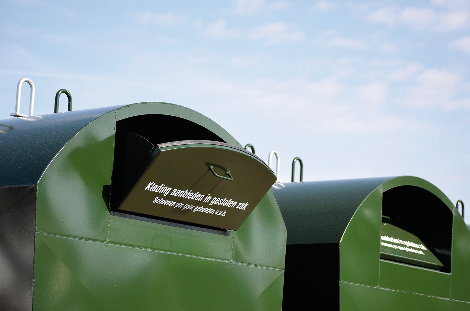 Hydraulic dampers prevent fingers from being trapped on old clothes containers, as they make opening and closing movements smoother